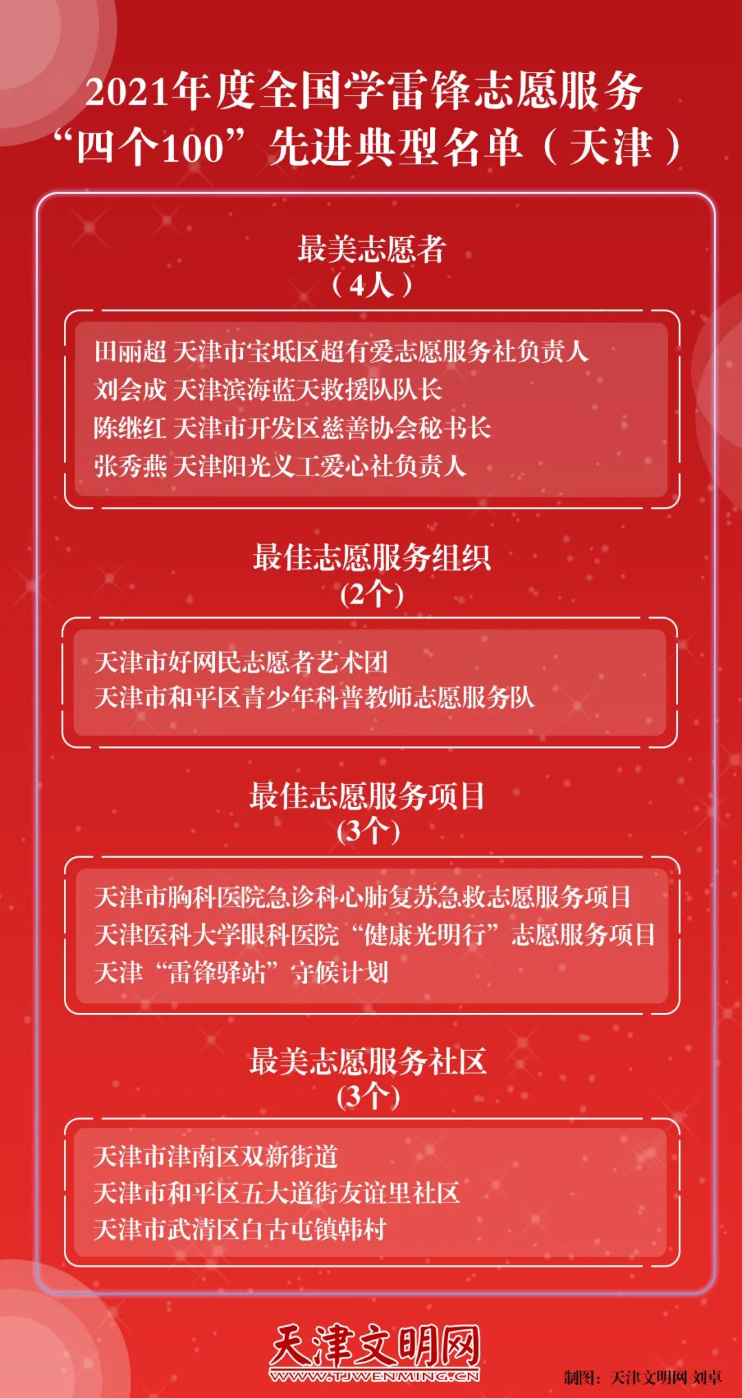 2021年10月至2022年3月,中央宣传部、中央文明办等部门和单位共同组织开展了2021年度全国学雷锋志愿服务“四个100”先进典型宣传推选活动,宣传推选出了100个最美志愿者、100个最佳志愿服务组织、100个最佳志愿服务项目和100个最美志愿服务社区。其中,天津12个先进典型上榜。