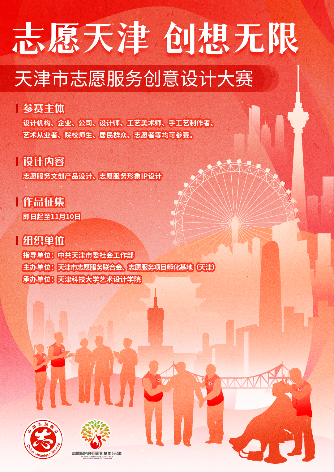 为进一步贯彻落实习近平总书记关于志愿服务的重要指示精神,贯彻落实《中共中央办公厅 国务院办公厅 关于健全新时代志愿服务体系的意见》,健全特色鲜明的志愿文化体系,市委社会工作部决定组织开展天津市志愿服务创意设计大赛,面向全市征集一系列富有创意、蕴含深意且能够引起共鸣的志愿服务主题设计,让志愿精神通过艺术与设计的力量,触及更广泛的人群,共同营造一个更加温暖、包容的社会氛围。